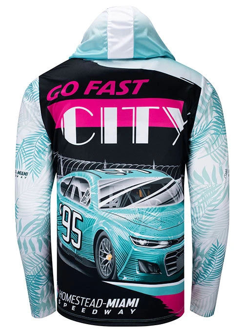Show your love for Homestead-Miami Speedway in this sublimated hooded long sleeve t-shirt!